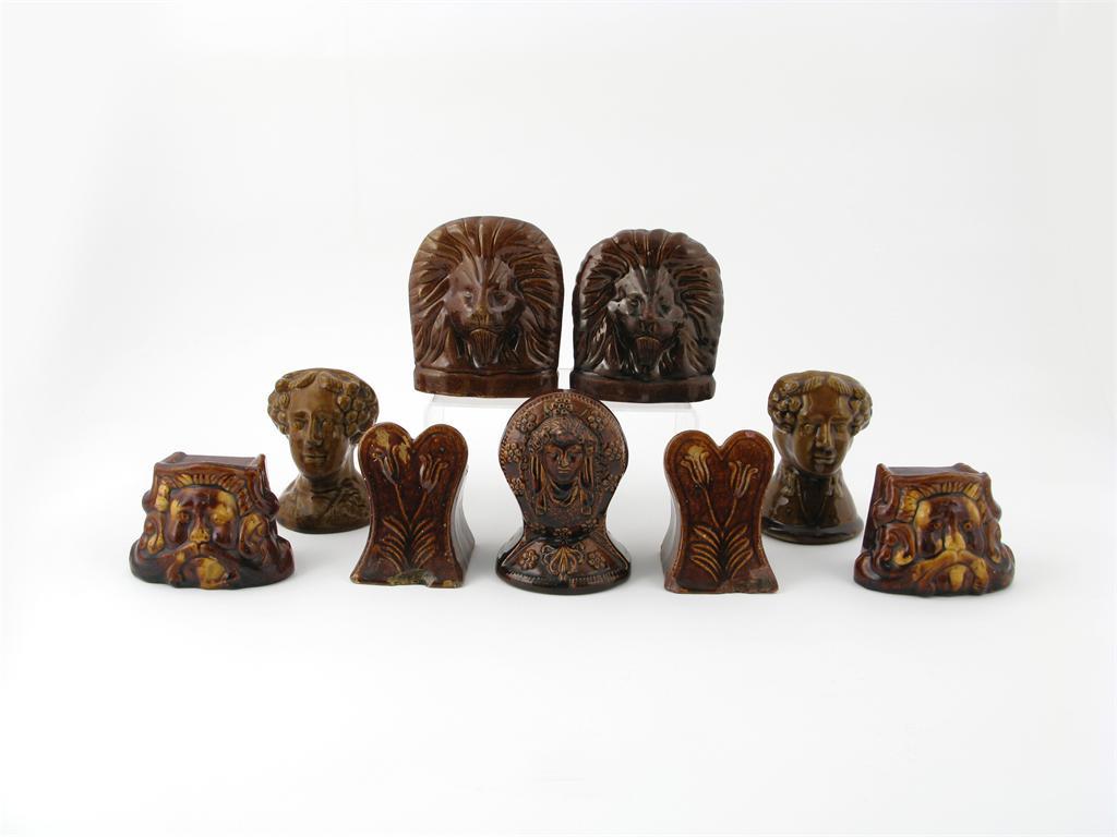 Eighteen furniture rests 19th century, variously moulded as lion heads, female busts and bearded Green Man type figures, all covered in a treacle glaze, some damages, 12cm max. (18)