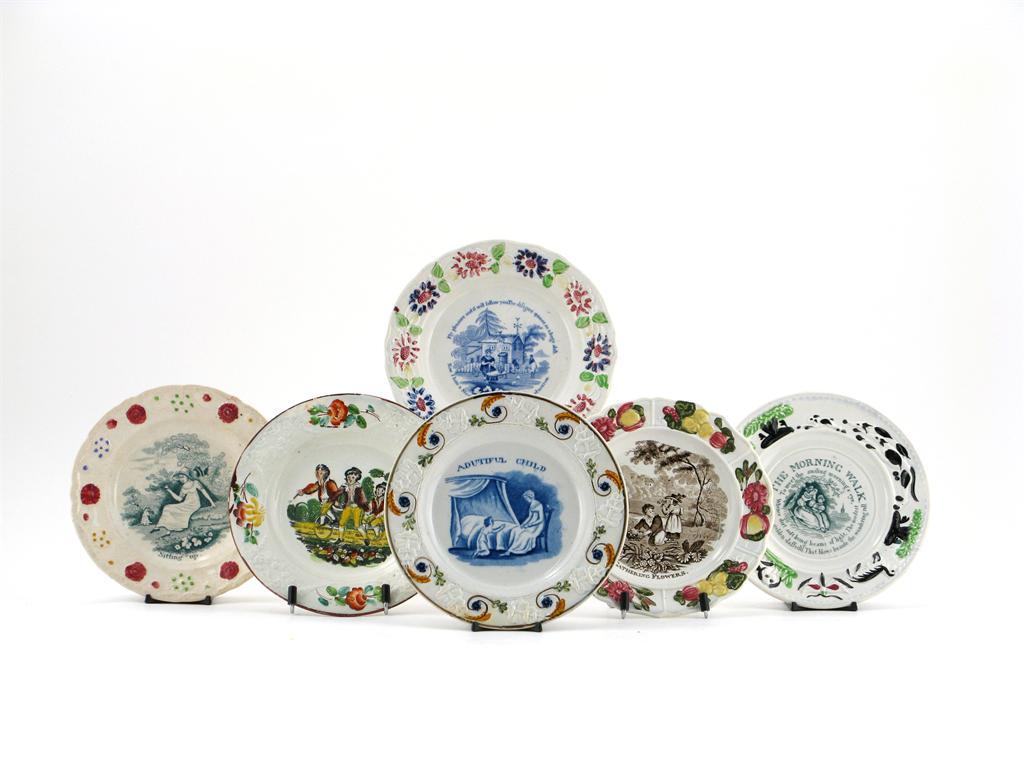 Six Pratt or pearlware children's plates 19th century, the wells printed with scenes of children at various pursuits within moulded and painted rims, a section of one rim broken, 18cm. (6)