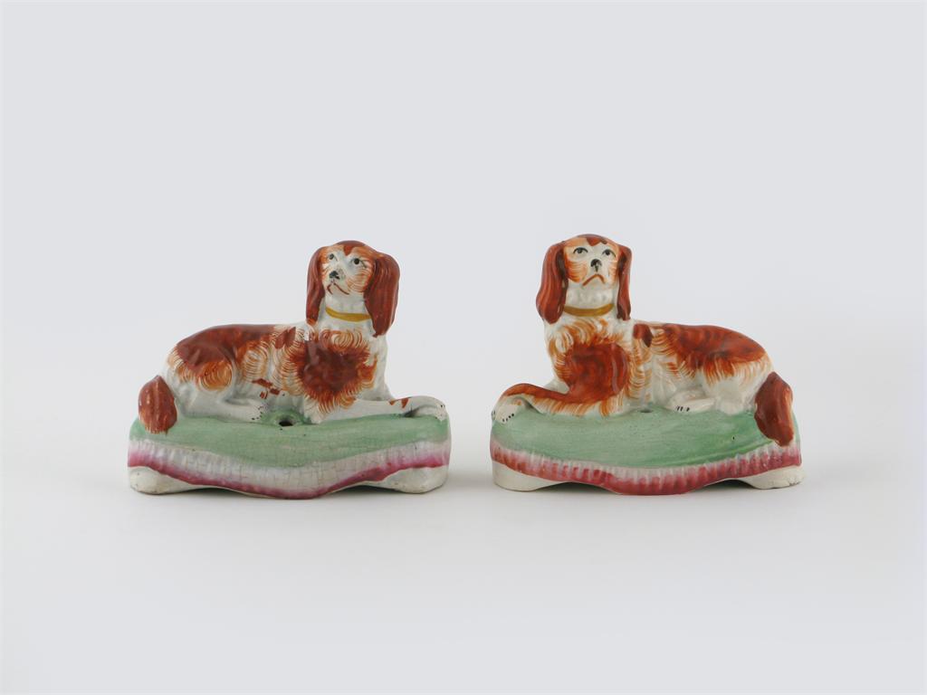 A pair of Staffordshire models of recumbent spaniels 19th century