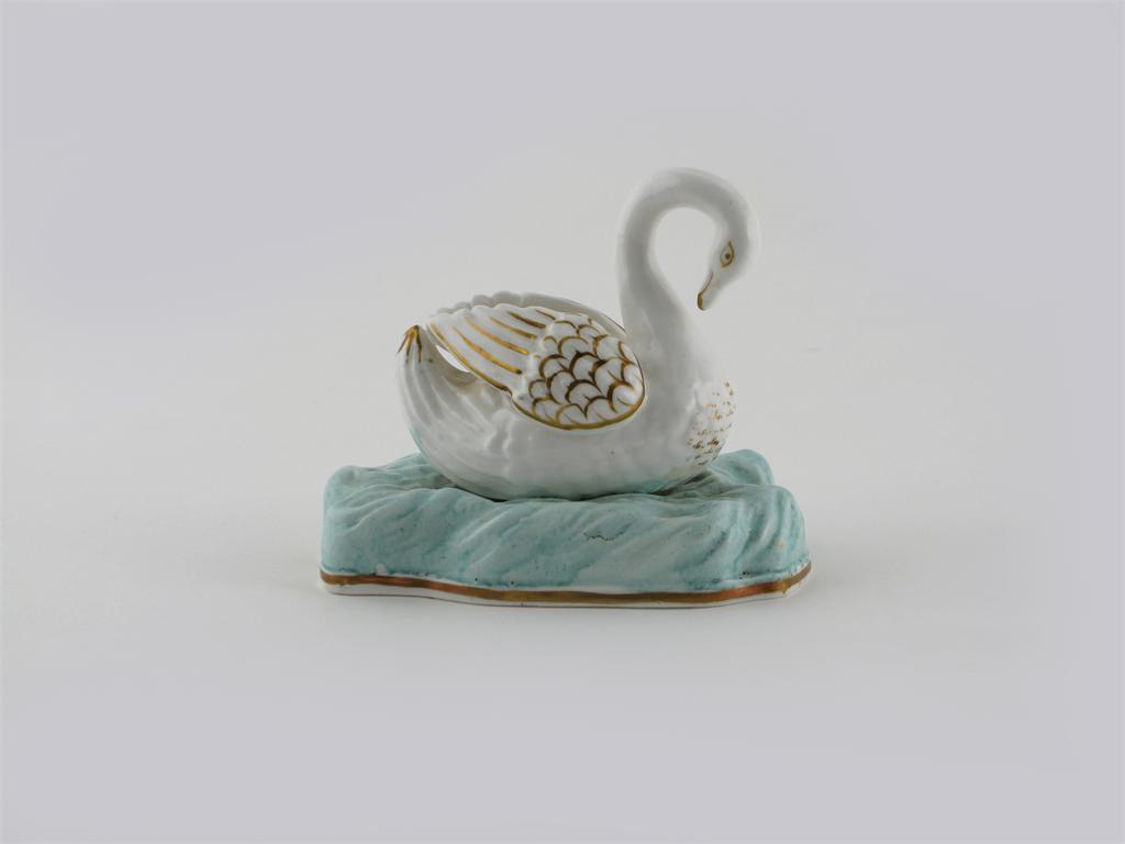 An Alcock porcelain model of a swan early 19th century, swimming proudly along a blue watery base, its wing feathers detailed in gilt, 13cm.