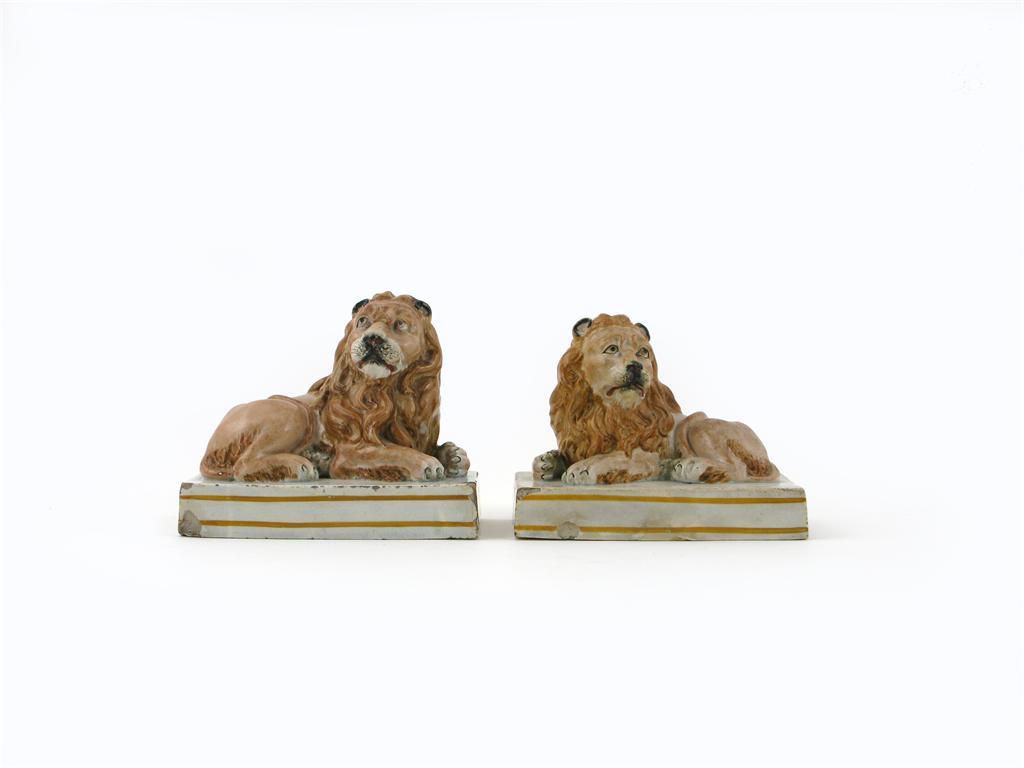 A pair of Wood & Caldwell pearlware lions c.1800, recumbent on rectangular bases highlighted with ochre lines, each with its head turned and tail flicked over its back, wearing charmingly quizzical expressions, impressed marks, a few small chips to the bases, 12.8cm.