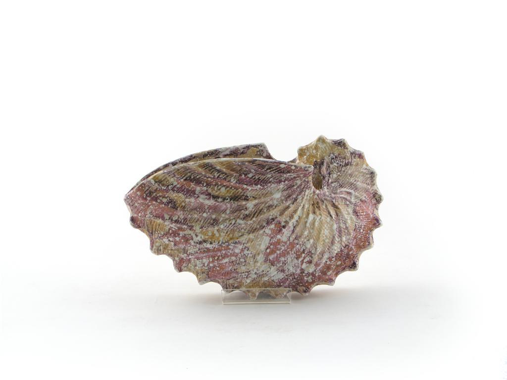 An English lustreware wall pocket 19th century, probably Spode, modelled as a large shell with spiral ribbing, decorated in a mottled glaze of sepia and purple lustre, damages, 25.5cm.