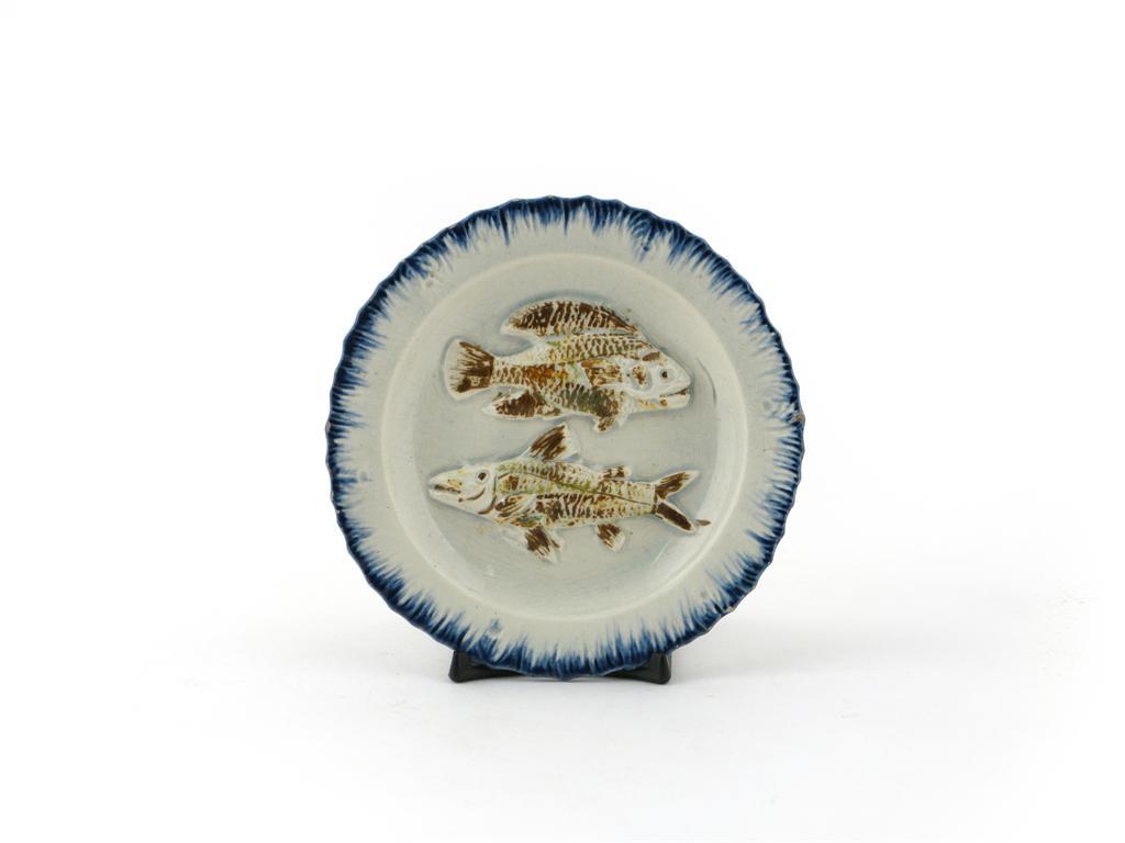 A small Pratt ware plate late 18th century, the well moulded with two fish, their scales highlighted in typical shades of ochre and umber, within a blue feather-moulded rim, 10.8cm.