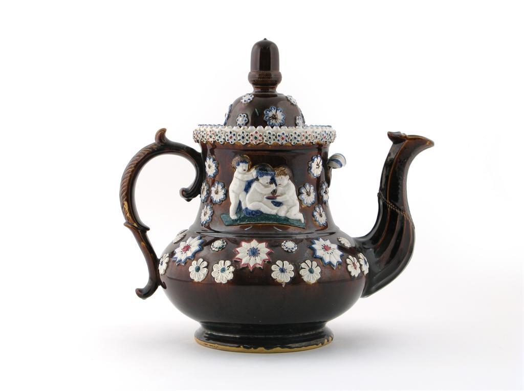 A large bargeware teapot 19th century, the pear-shaped body applied with floral roundels and vignettes of three putti, 45cm. (2)