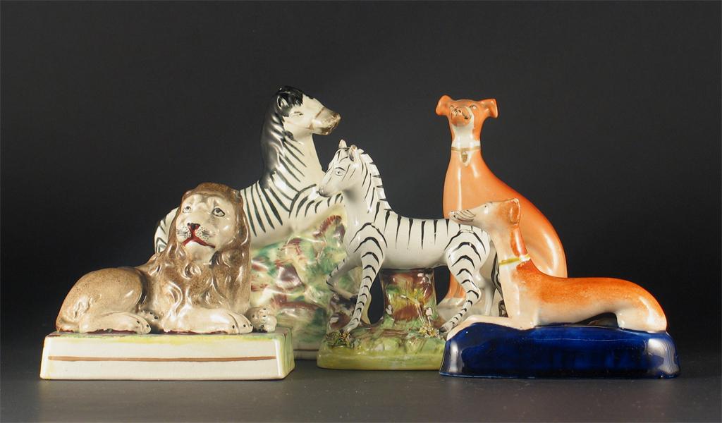 Two Staffordshire zebra, a recumbent lion and two greyhounds. The smaller zebra with damage. All 19th century, 15.5cm. Max. (5)