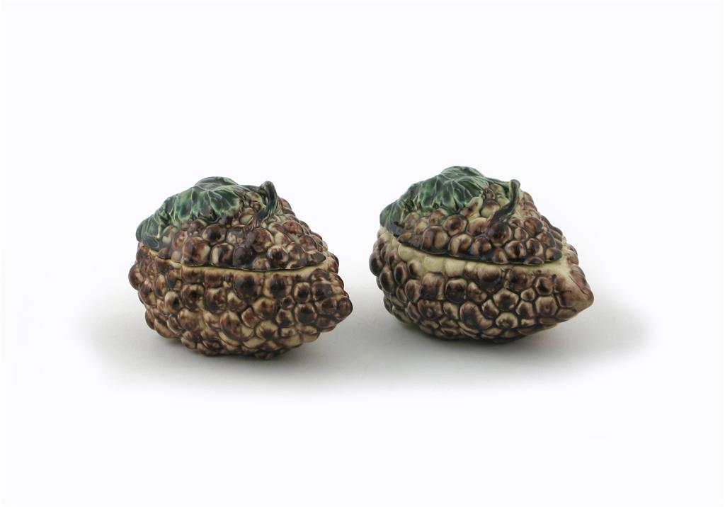 A pair of creamware boxes and covers late 18th century, each modelled as a bunch of grapes with vine leaf covers, decorated in a Whieldon-type glaze of brown and green, some good restoration to the covers, 14cm. (4)