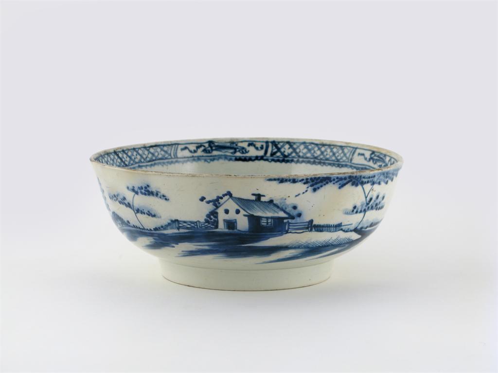 A blue and white pearlware bowl late 18th century, the exterior painted with simple buildings in a landscape, the interior inscribed 'Jolly Mortals Fill Your Glases' [sic], some restoration, 24.5cm.