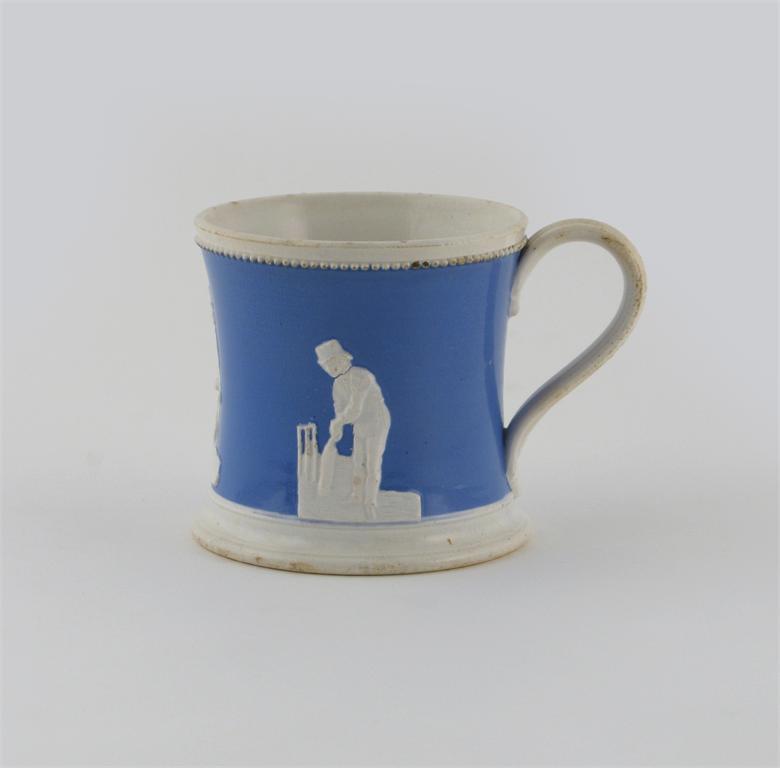 Cricketing interest: a pearlware mug 1st half 19th century, the slightly waisted form applied with two batsmen and a bowler in white on a blue ground, 10cm high.