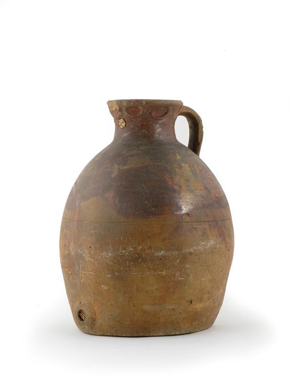 A massive Donyatt brewing pot late 18th century, the bulbous form with traces of a yellowish glaze, a short handle reaching from the neck to the shoulder, some surface wear and chipping, 46cm.