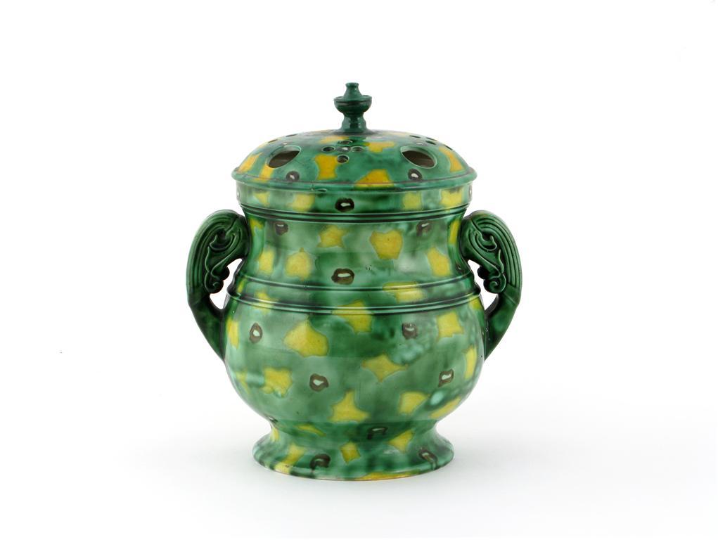 A creamware urn and cover early 19th century, decorated with an egg and spinach glaze, the cover pierced with an arrangement of holes, restoration to the cover, 27cm. (2)