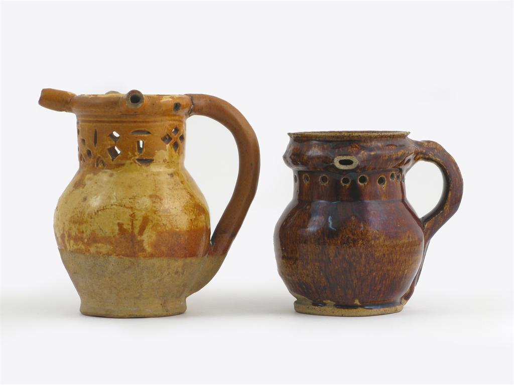 Two slipware puzzle jugs early 19th century, decorated in a treacle type glaze, the necks variously pierced with geometric designs, minor damages, 17cm max. (2)