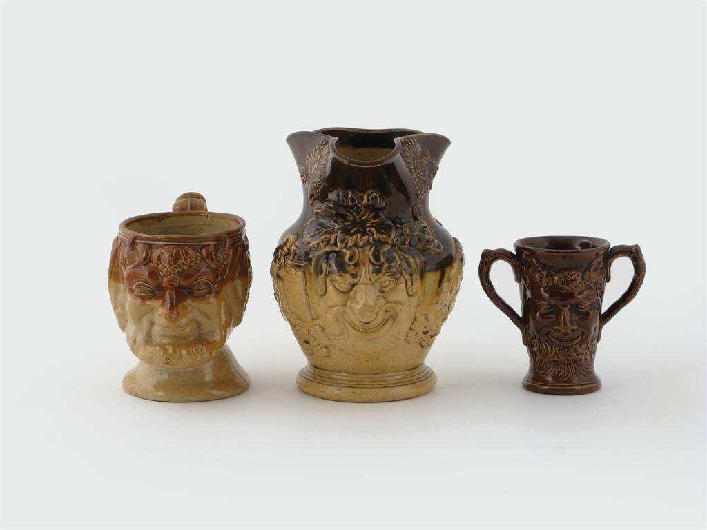 Three brown stoneware face mask vessels 19th century, one jug with an unusual sunburst sprig to each side of the rim, applied with scenes of topers, a smaller jug and two-handled mug moulded as Bacchus, some restoration to one, 20cm max. (3)