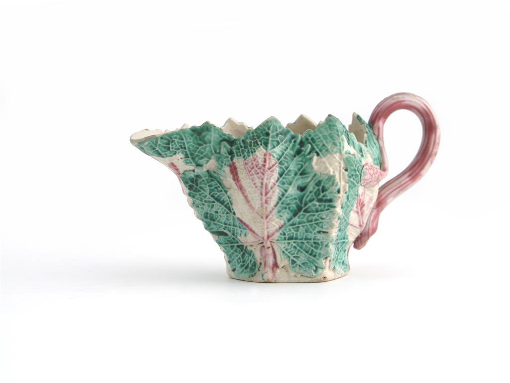 A small salt-glazed leaf moulded cream jug c.1760, the folds and veins of the leaves picked out in green and pink enamels, minor faults, 12cm.