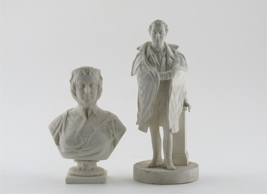 A Minton Parian bust of the Duchess of Sutherland c.1869, modelled by Matthew Noble, impressed marks, and a Minton biscuit porcelain model of the Duke of Wellington, leaning on a plinth and pulling his cloak around his shoulders, a chip to one finger, 28cm max. (2)