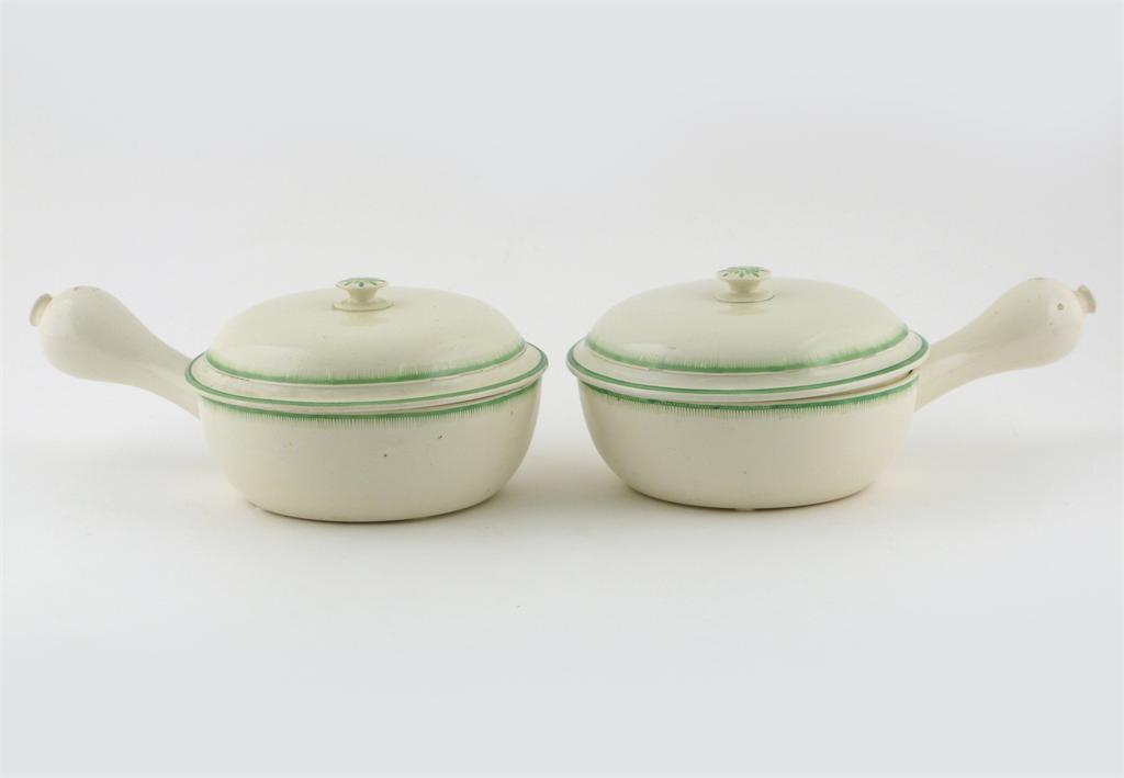 A pair of creamware handled tureens and covers c.1800, enamelled with bands of apple green, 29cm across. (4)