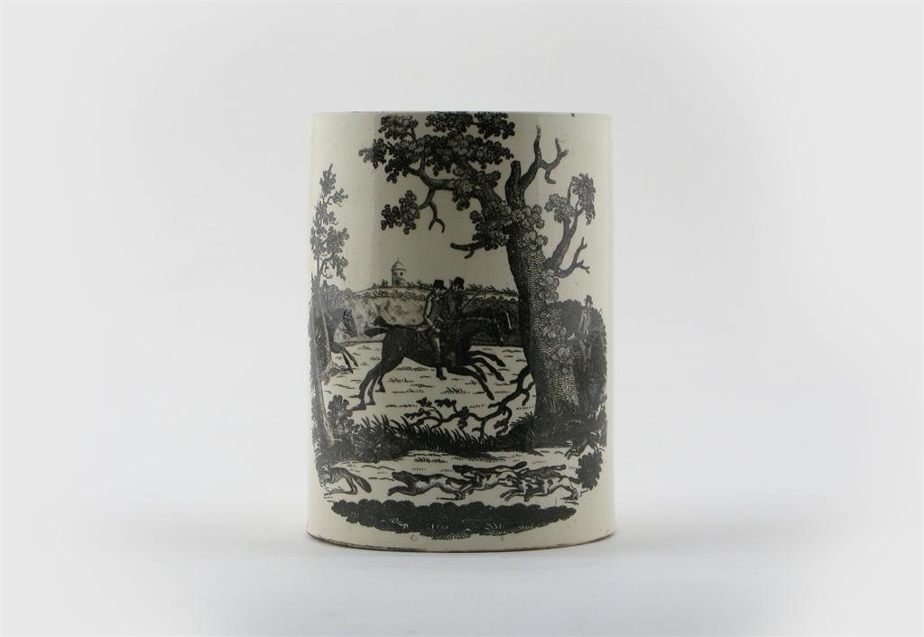 A creamware mug late 18th / early 19th century, printed with a foxhunt scene, 15cm.