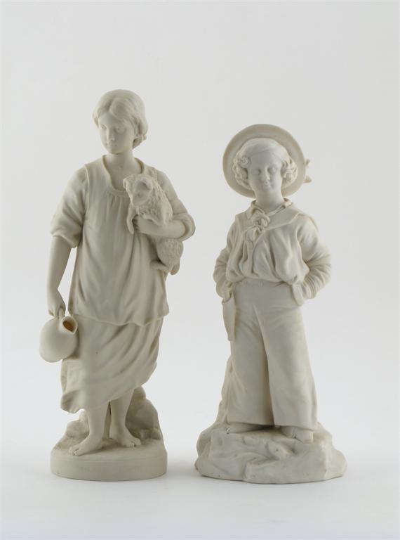 A Copeland Parian figure of The Cottage Girl c.1876, after Gainsborough, modelled holding a small dog and a jug, titled, impressed signature and mark to the reverse, and a Minton Parian figure of the Prince of Wales, after the 1846 portrait by Franz Xavier Winterhalter, 37cm max. (2)