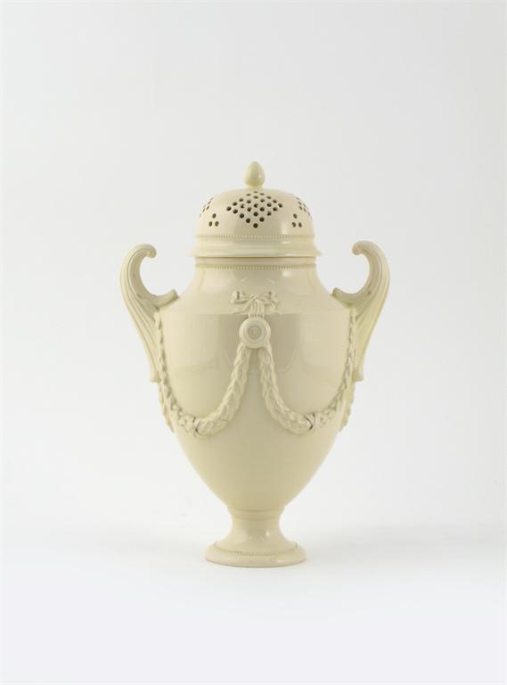 A creamware vase and cover 19th century, moulded with garrya swags issuing from tied ribbons and applied roundels, the domed cover pierced with a geometric design, some good restoration, 31.5cm. (2)