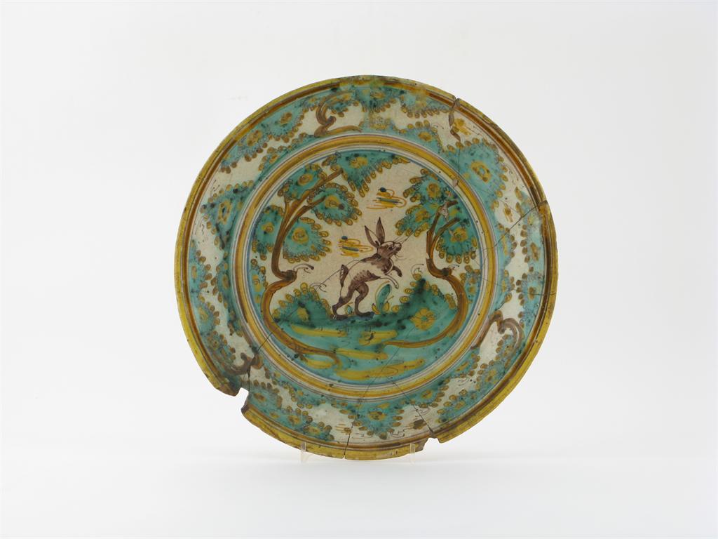 A Talavera or Puente del Arzobispo dish 17th century, painted in a typical palette with a large rabbit raised on its haunches between two trees, within a border of branches, damaged and riveted, 37.5cm.