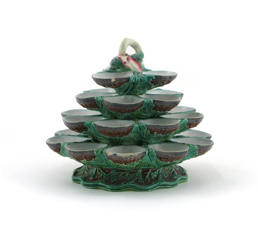 A Minton Majolica oyster dish, with four graduated tiers of shells surmounted by a fish and eel finial, rising from a base moulded with seaweed, impressed numbers and date code for 1872, a small chip to one shell, 25cm.