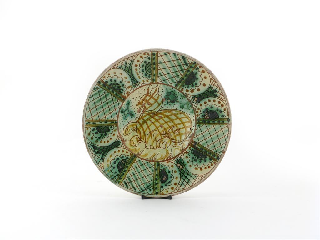 A sgraffito earthenware dish, perhaps Italian, decorated with a central dog-like creature within hatched bands and panels of flowers, 24.5cm.