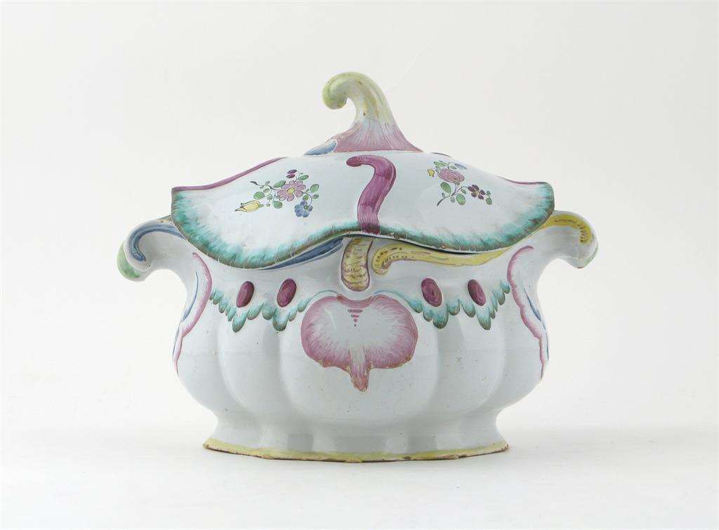 A Continental faïence tureen and cover 1st half 19th century, the rococo moulded form picked out in polychrome enamels, the lid painted with flower sprays, some good restoration to the knop and handles, 34cm. (2)