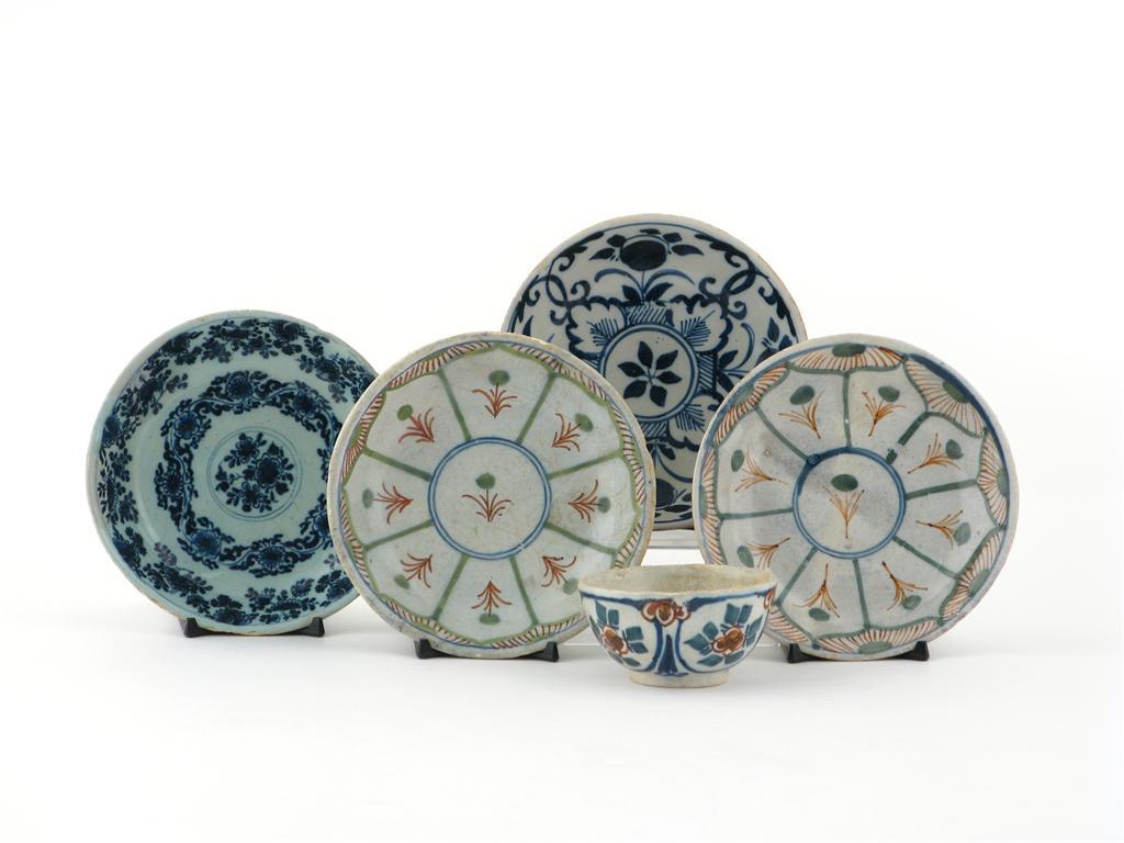 Four delftware saucers 2nd half 18th century, two decorated with a stylized flowerhead design in green and red, two others with differing floral designs in blue, and a similarly decorated teabowl, restoration, 11.3cm. (5)