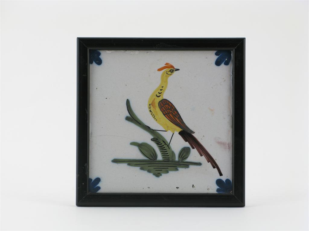 A delftware polychrome tile 2nd half 18th century, decorated with a single long-tailed yellow bird, perched on a green stem, each corner with a blue trefoil motif, mounted in a wooden frame, 12.2cm.