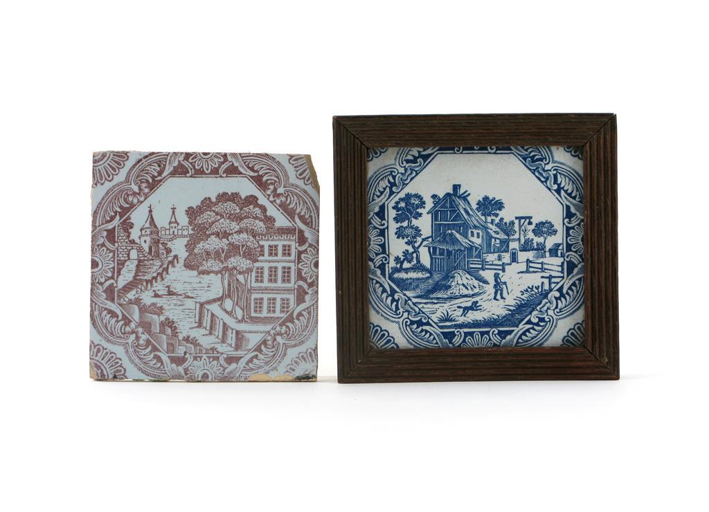 Two delftware printed tiles 18th century, probably Liverpool and printed by Sadler, one in blue with a figure walking his dog before farm buildings, the other in manganese with ducks swimming in a municipal river, both within octagonal panels with elaborate edges, one in a wooden frame, minor damages, 13cm. (2)