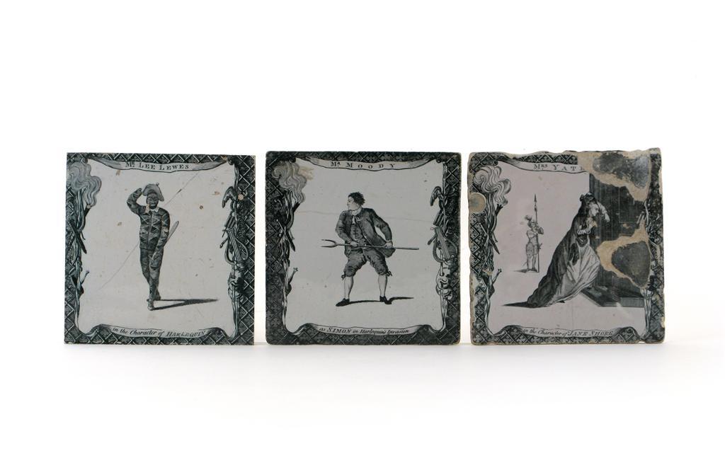 Theatrical interest: three delftware printed tiles 2nd half 18th century, probably Liverpool printed by Green, in black with three famous thespians in well known roles, within borders of theatrical motifs, titled, damages, 12.5cm. (3)