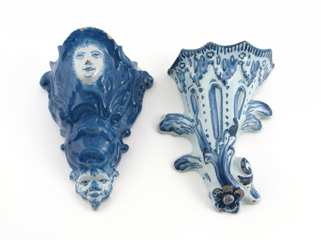 Two delftware wall pockets 2nd half 18th century, one blue glazed with a central human mask, the visage of a bearded mythical being at the base, the other moulded with stylized flowers and foliage detailed in blue, some damages, 21cm. (2)