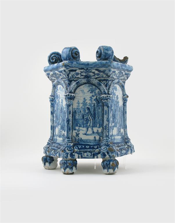 A large Delft hexagonal jardinière stand 19th century, each side painted in blue with figures in landscapes between moulded colonnades, raised on six ball feet and with scroll ball rests to the top, damages and losses, 40cm.