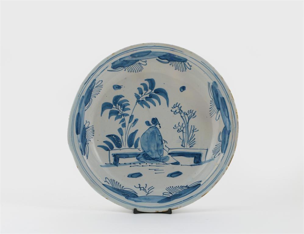 A delftware saucer dish late 17th century, probably Brislington or London, painted in blue with a seated Chinese figure in a garden scene, a restored rim section, 22cm.