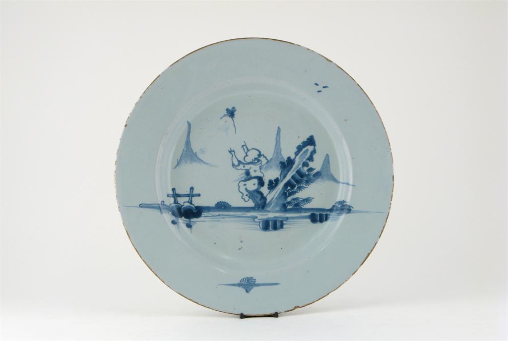 A large delftware dish 2nd half 18th century, perhaps Brislington, painted in blue with a Chinese boy chasing a butterfly before mountains, 36cm.