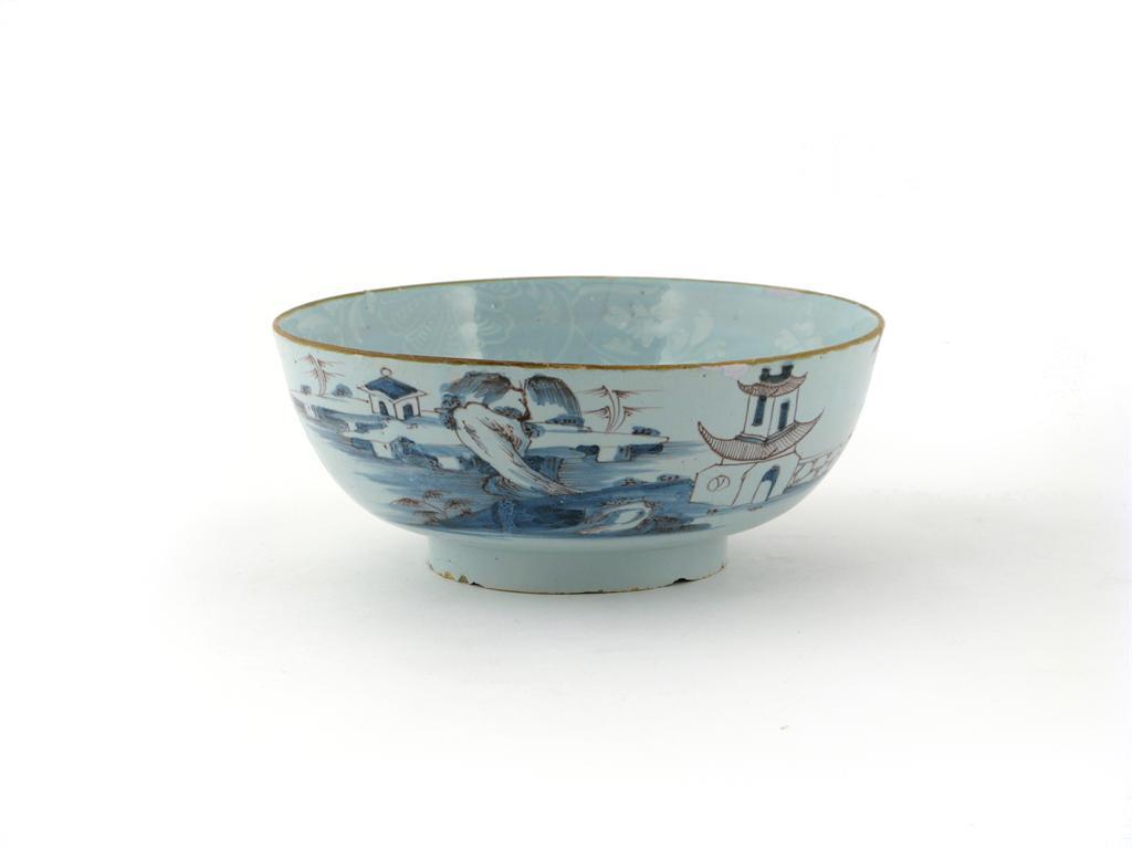 A delftware bowl 2nd half 18th century, the exterior painted in blue and manganese with buildings in an Oriental landscape, the interior inscribed 'One Bowl More And then' beneath a bianco-sopra-bianco border, a section broken out and reglued, 23cm.