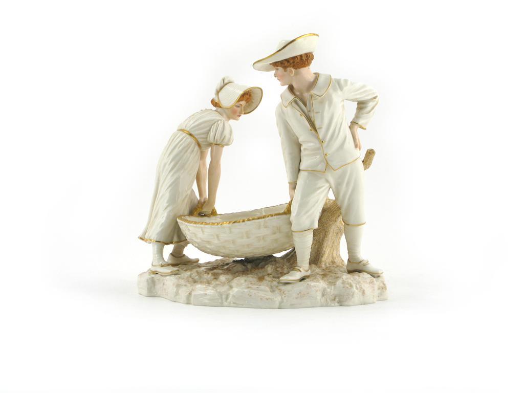 A Royal Worcester figural centrepiece late 19th century, a labourer and his companion struggling to lift an enormous basket which rests on the remains of a large tree trunk, the details highlighted in gilt, applied mark, 27cm.