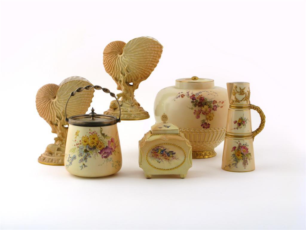 A matched pair of Royal Worcester blush porcelain nautilus shell vases early 20th century