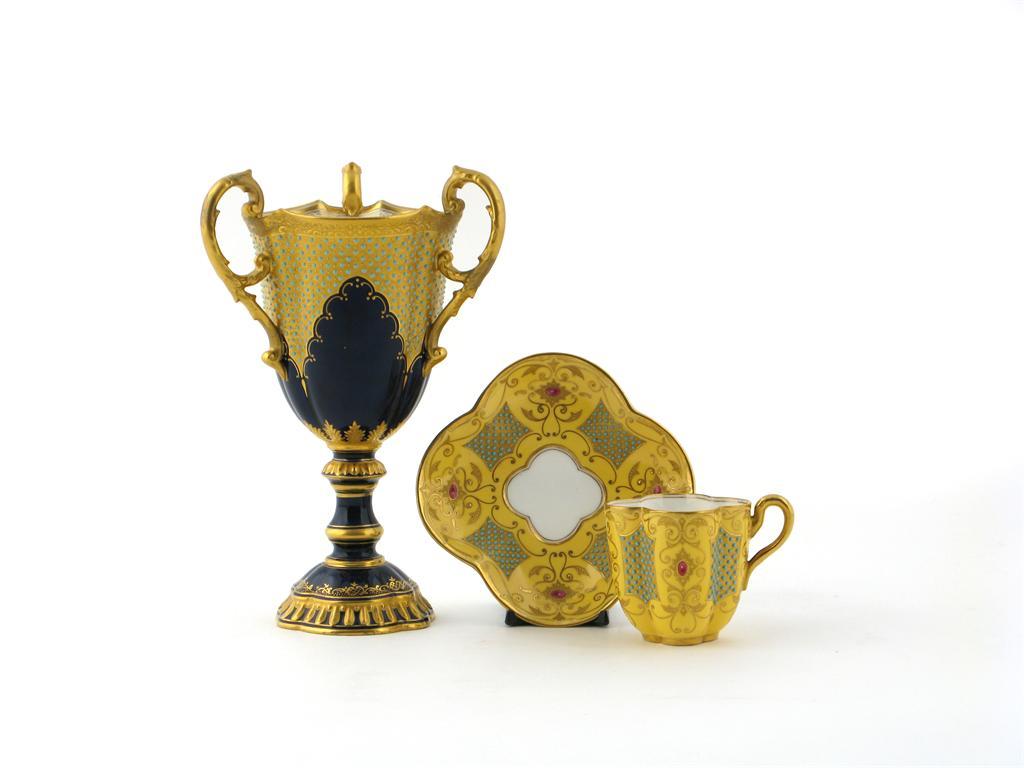 A jewelled Coalport three-handled cup late 19th century, the cobalt blue body applied with turquoise beads on gilt panels, and a Coalport cruciform cup and saucer, similarly decorated on a yellow ground, printed factory marks, 22cm max. (3)