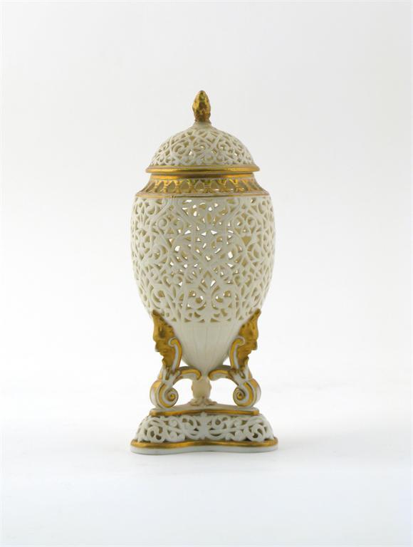 A Grainger's Worcester reticulated vase and cover c.1875, the cream body delicately pierced in the manner of George Owen with an elaborate foliate scrolling design, some damage to the cover, 20cm. (2)