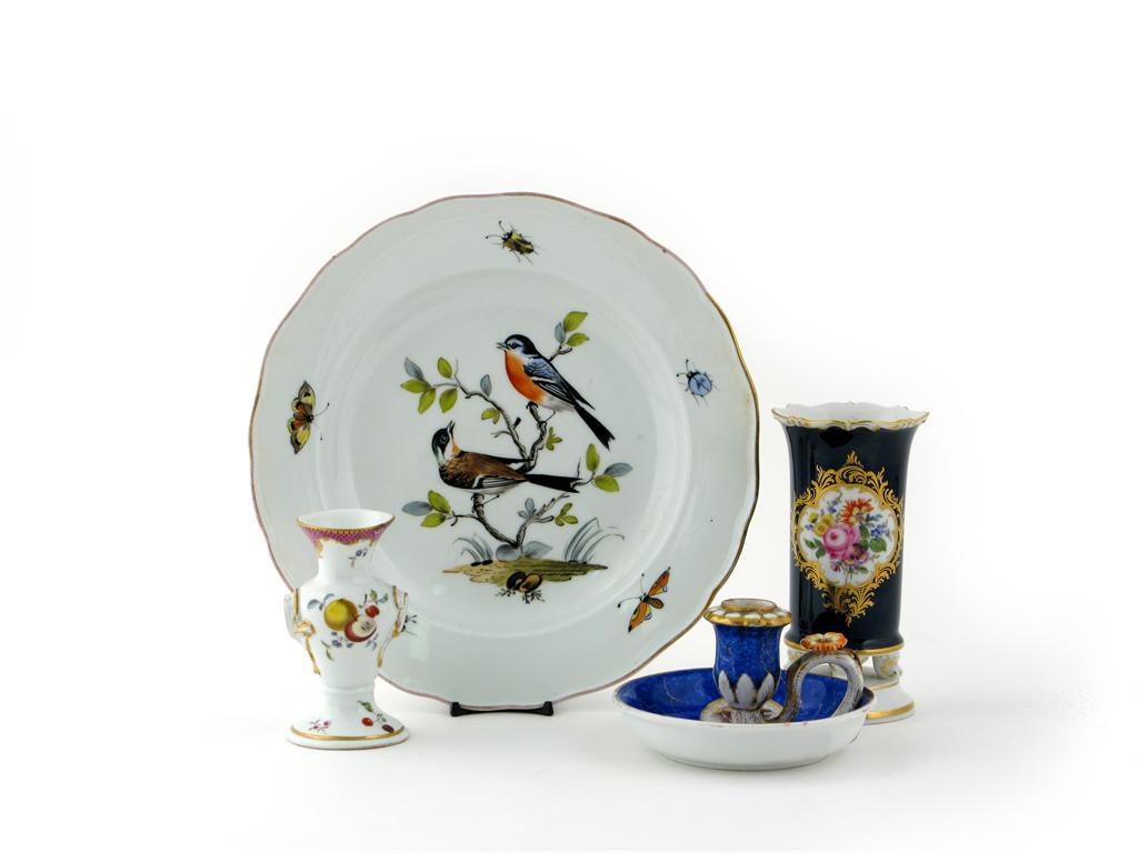 Various Meissen porcelain 20th century and earlier, including a small vase painted with fruit, a floral spill vase, a plate painted with birds and scattered insects, and a chamberstick painted with panels of figures, blue crossed swords marks, two cancelled, 24.8cm max. (4)