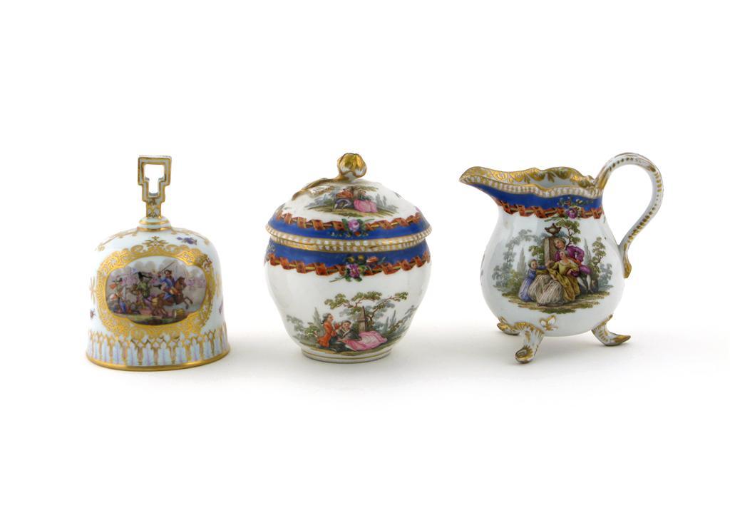 A Meissen sucrière and cover with matching milk jug 19th century, later decorated with courting couples, and a Meissen bell painted with battle scenes, cancelled blue crossed swords marks, 10.5cm. (4)