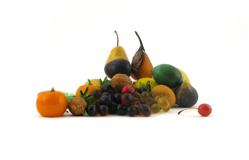 A collection of fruit, including glass and plastic, modelled as grapes, lemons, pears and a pomegranate. (20)