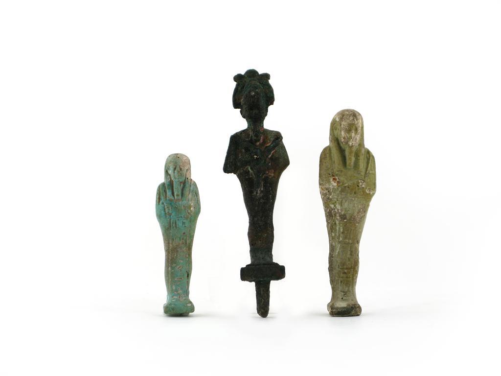 Two Egyptian faïence ushabti, each decorated in an all over greenish glaze, and a similar bronze figure with heavily degraded surface, 17.5cm max. (3)