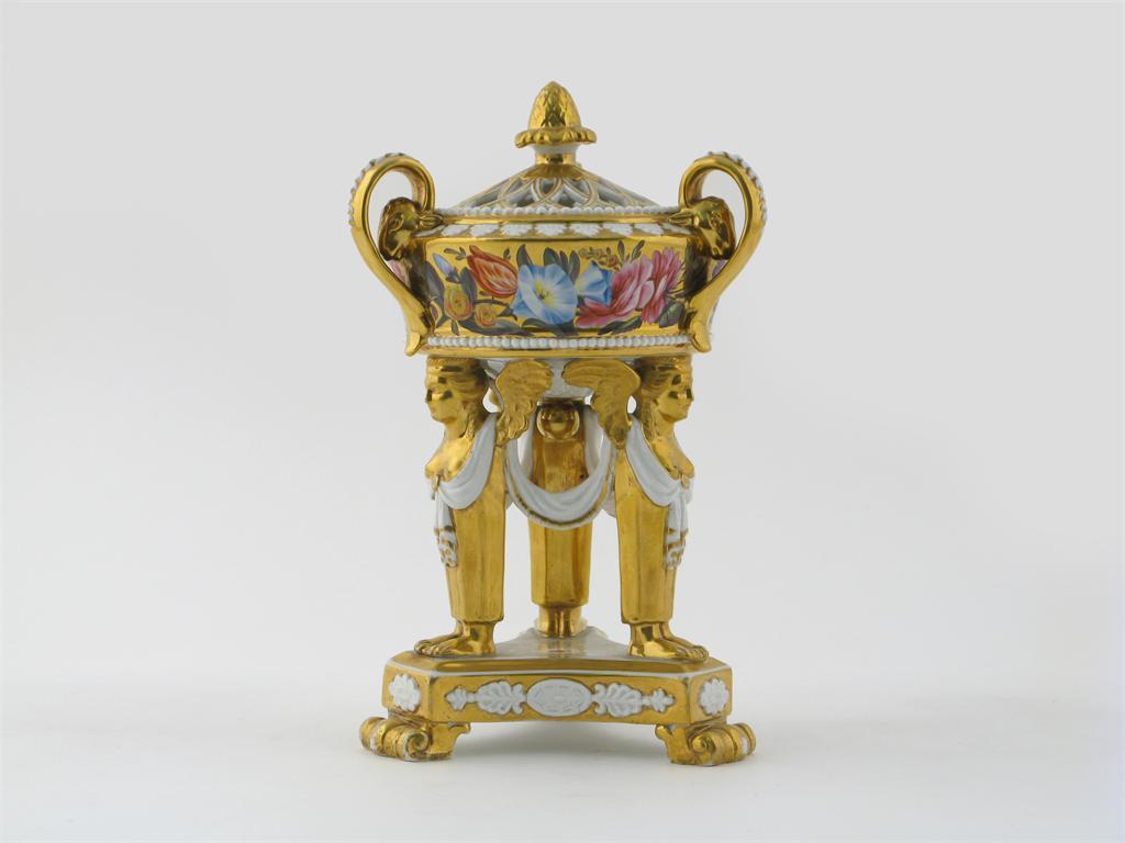 An English porcelain pot pourri vase and cover c.1820, probably Spode, the shallow bowl painted with a band of naturalistic flowers on a gilt ground, raised on three term feet standing on a triform base, the three scroll handles issuing from ram heads, the cover of a pierced petal design, 23.5cm. (2)