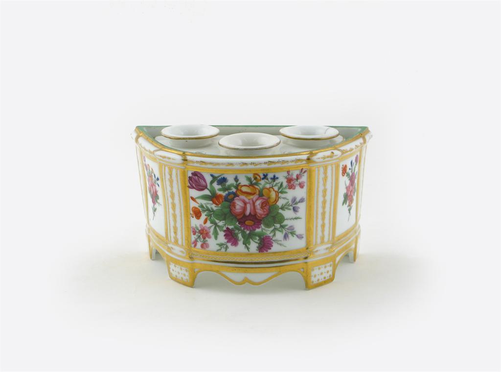 A Paris porcelain bough pot and cover 19th century, painted with floral arrangements in three panels, the cover pierced with three lipped openings, some restoration to the cover, 24.5cm. (2)