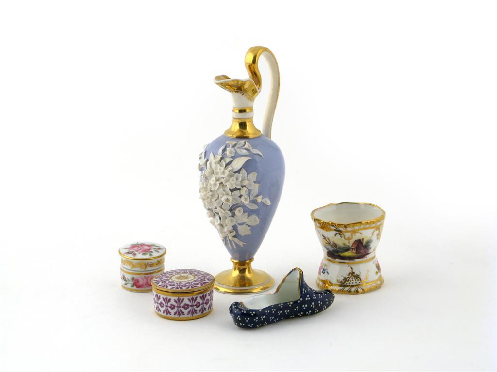 A Daniel egg cup 1st half 19th century, painted with buildings and flowers, an English porcelain ewer applied with an effusion of flowers in white on a lilac ground, two miniature boxes and covers and a jewelled model of a slipper, 16cm max. (7)