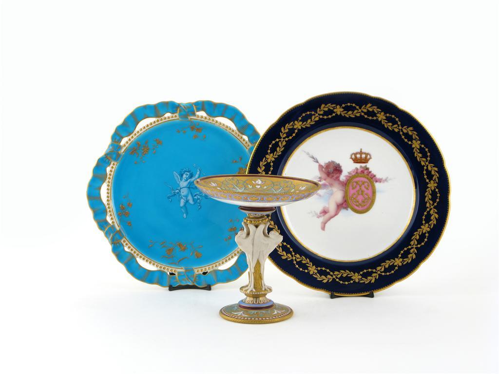 A Minton porcelain stand c.1865, the gilt dish painted in the Gothic style with an elaborate green design, the stem encircled by three herons in biscuit porcelain, a Minton cabinet plate decorated with a putto holding a crowned monogrammed shield, and a Brown-Westhead Moore & Co plate enamelled with Cupid on a turquoise ground, signed to his flowing robe, some damages, 23.5cm.
