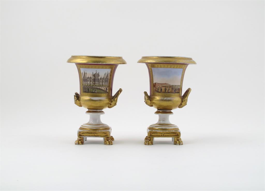 A pair of English porcelain campana vases 19th century, painted with figures before Brighton Pavillion and on a beach, on a claret ground with gilt stylized floral bands, one handle lacking, one broken, 16.8cm. (2)