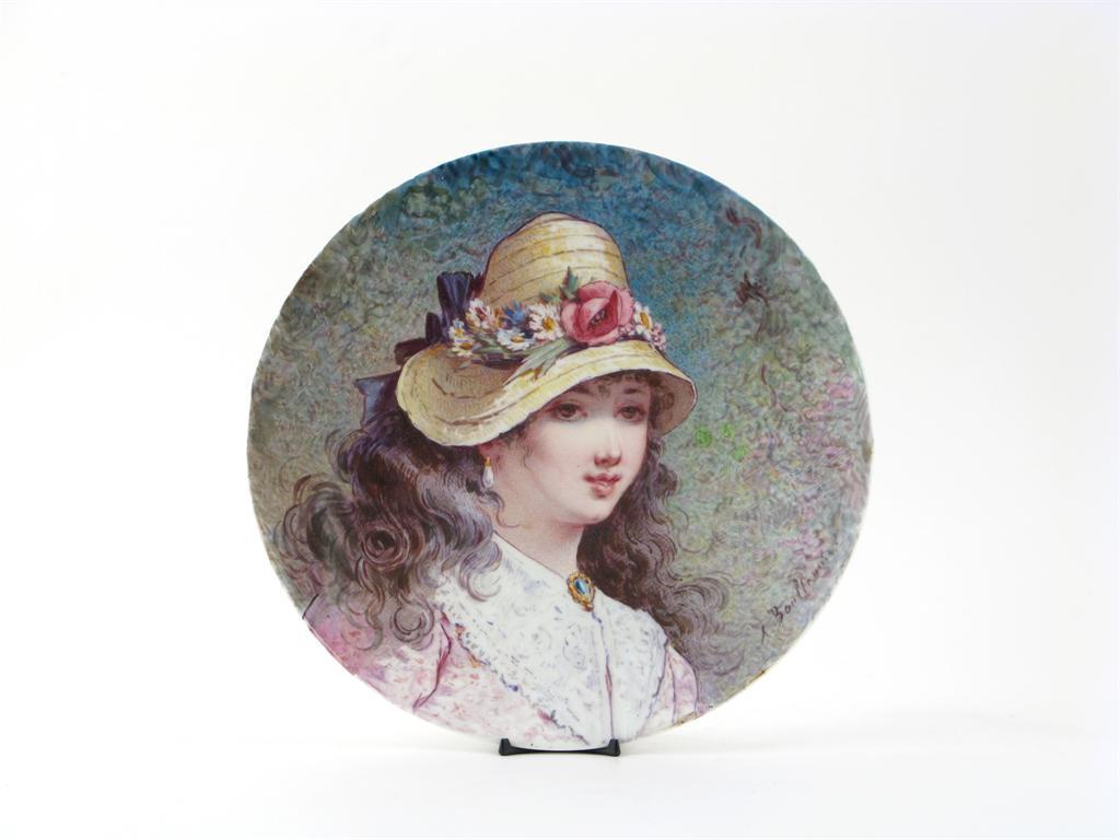 A Minton porcelain portrait plate late 19th century, studio decorated with the portrait of a young girl wearing a summer hat, inscribed 'A Boullemier', faint impressed mark to the reverse, 26.5cm.