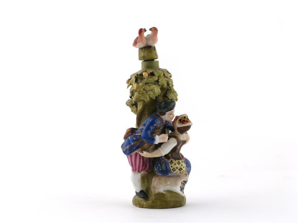 A Samson scent bottle 2nd half 19th century, after Derby, modelled as two lovers embracing beneath an oak tree, the stopper formed as two turtledoves, pseudo factory mark in red, some restoration, 10cm.